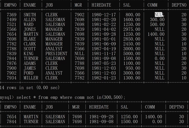 not in 查询结果不会显示为null的值。